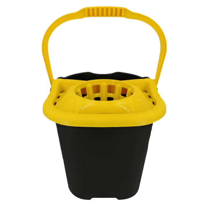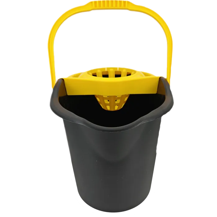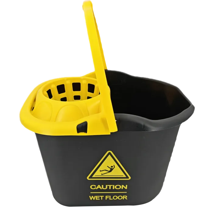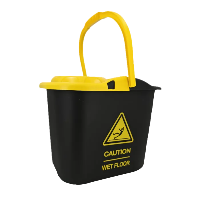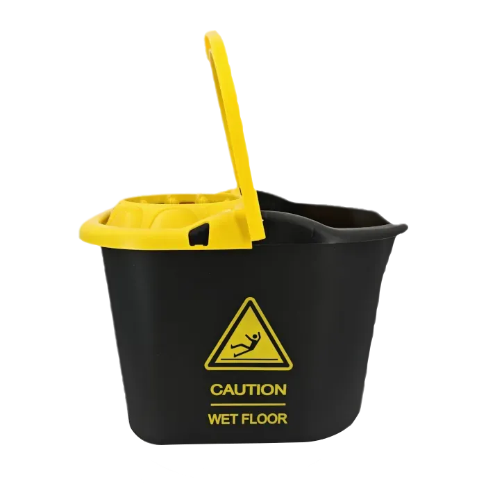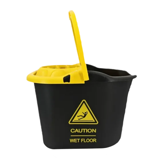Garantiza la máxima seguridad en tus tareas de limpieza profesional con el cubo caution 15 litros. Este innovador cubo con escurridor destaca por su llamativo diseño en color negro con textos en amarillo brillante, incorporando una señal de advertencia de «Suelo Mojado» serigrafiada en ambas caras.