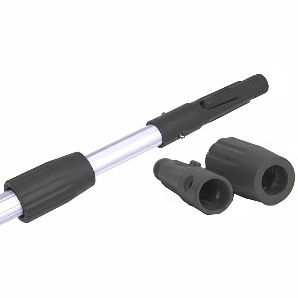 Este mango telescópico es perfecto para trabajos de limpieza en altura, permitiendo acceder a lugares difíciles. Es adaptable a una amplia variedad de accesorios, lo que lo hace ideal para la limpieza de cristales, techos y zonas de difícil acceso en entornos profesionales.